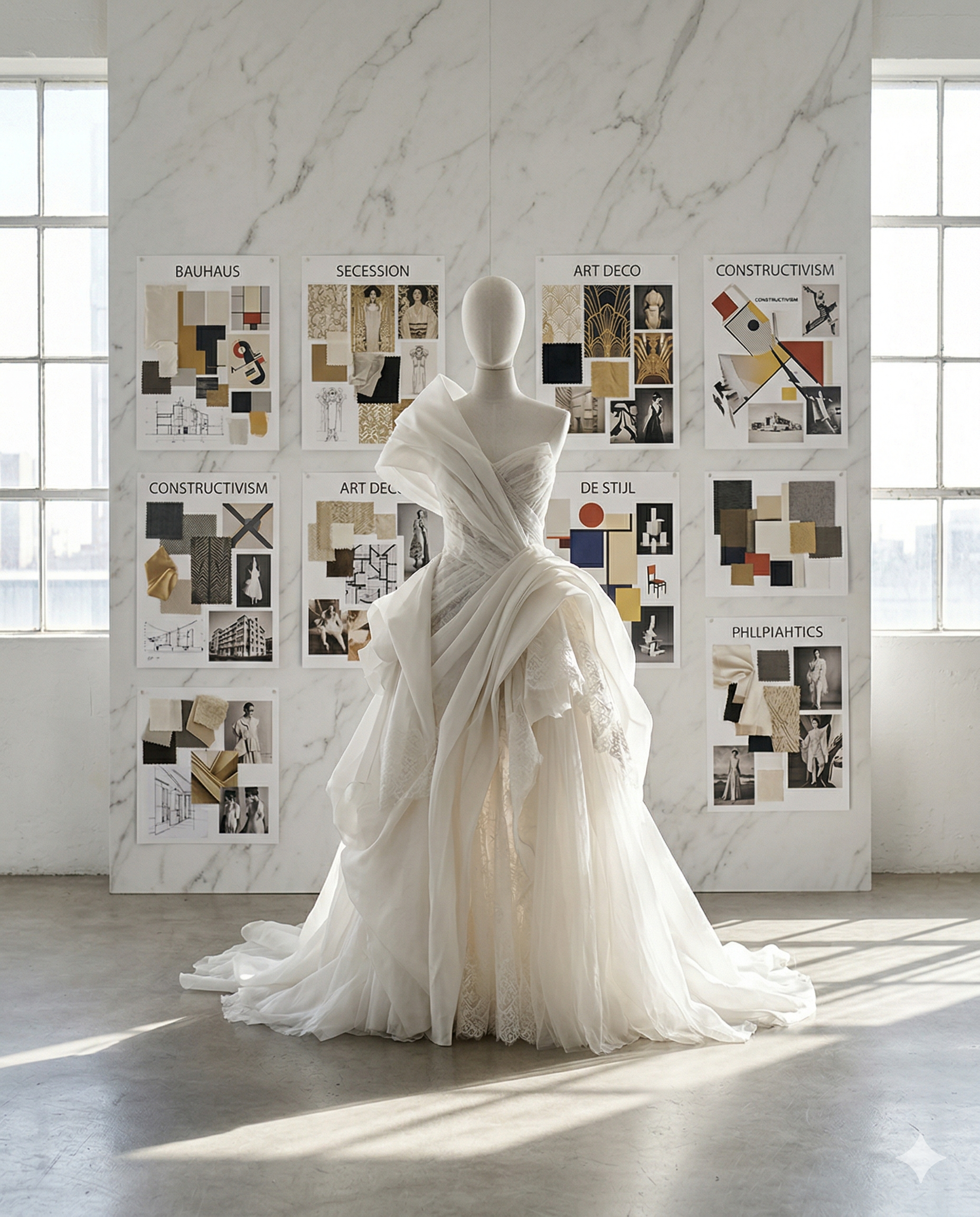 - Silüet: Heykelsi drapeler, antik Roma-Yunan stili omuz detayları.